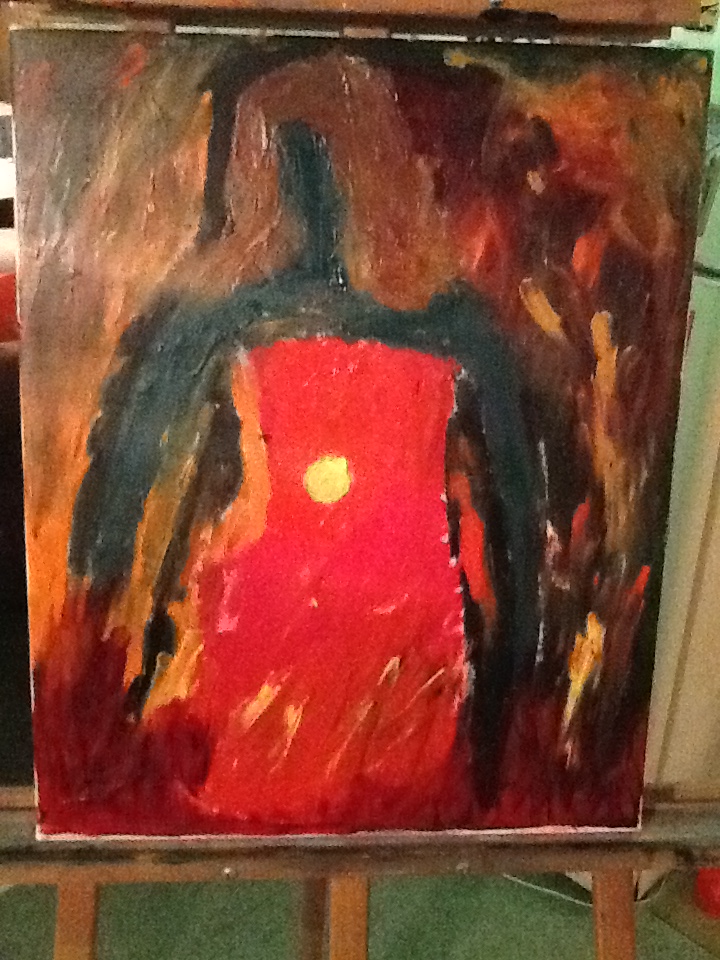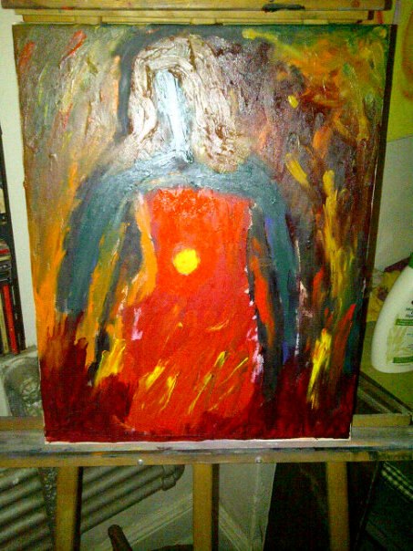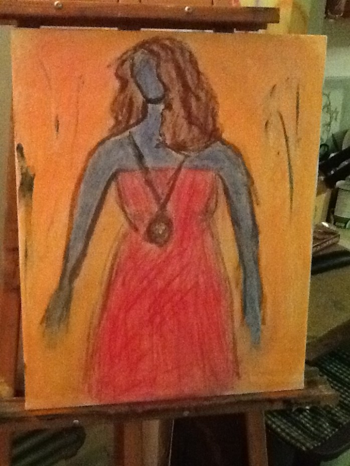 So I picked up the abandoned canvass, that woman and her baby, and erased the baby out of the picture. Even though the pencil lines were eventually covered up with cante, pastel’s and then oil paint, I can still see where the baby is-I know where it used to be. This is not a representation of pregnancy, only that I know the woman in the picture has lost something. I gave her a necklace to symbolize what she had lost, or perhaps where her spiritual centre was. It was a pentagram, but is now only a small circle of gold, but the pencil lines are still there too.