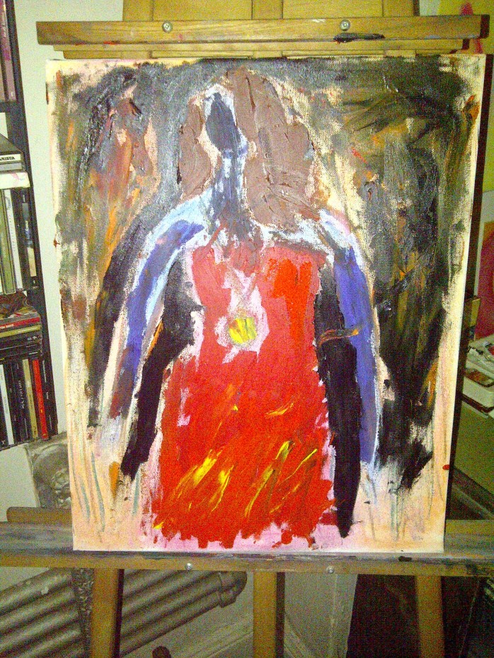 “Carrie” started as a ruined canvass. It was to be the third in a triptych that I had done in a series of women with blue flowers. The first one is one of my very favourite pieces. The second turned out less so. I had started the third, a woman holding a baby, in pencil with a red dress in cante (charcoal pastels) and an outline.