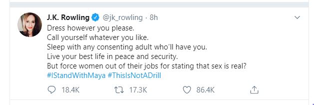 “Dress however you please. Call yourself whatever you like. Sleep with any consenting adult who’ll have you. Live your best life in peace and security. But force women out of their jobs for stating that sex is real? #IStandWithMaya #ThisIsNotADrill”