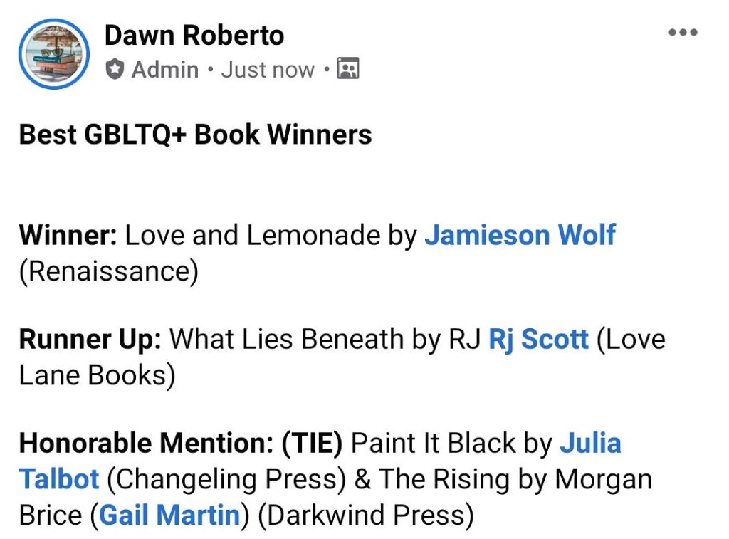 I’m so proud of writing this novel and so very proud of the fact that it won the title of Best GLBTQ+ Book of 2019. I am overjoyed and I don’t have the words to express my thanks. It was nominated alongside other really amazing books!
