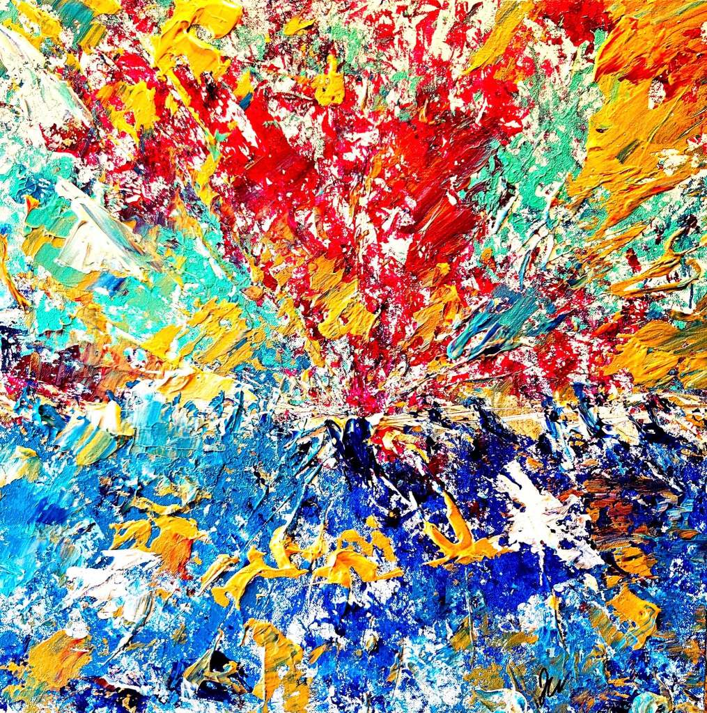 When I painted this canvas, I wanted to depict the mountains that I’ve had to climb being disabled in an able world. The idea behind the piece was to make it look as if I was standing on a mountain surrounded by a sky filled with the resilient light of my spirit. I wanted to depict the fact that despite the challenges I’ve had to face, I still shine bright like the sun even though I’ve had to fight against the ableism which seeks to keep me down.